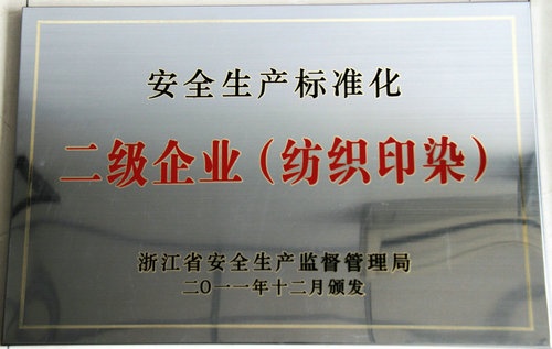 2011年12月,浙江嘉名染整有限公司被浙江省安全生產(chǎn)監(jiān)督管理局命名為安全生產(chǎn)標(biāo)準(zhǔn)化二級企業(yè)